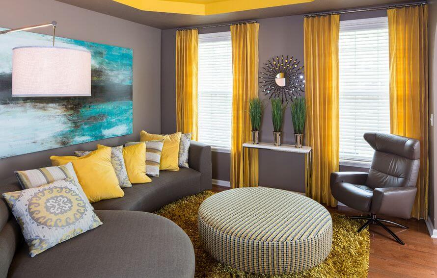 Kontrastní pár, který může vypadat velice nápadivě, živě a hravě. Žlutou můžeme použít jako základ pro stěny a doplnit ji šedým nábytkem a doplňky. Pokud je ve vašem interiéru základem šedá, můžete to udělat naopak a oživit prostor žlutými polštáři, dekorativními předměty či uměním ve žlutých tónech.