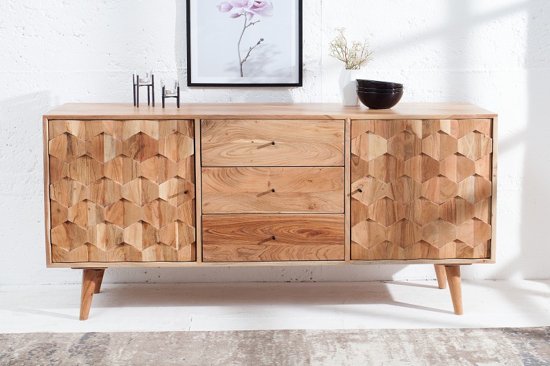 Zajímavá komoda ze série Mystic, ve které nalezeme tři varianty. Komoda vyrobená z masivního dřeva exotické akácie a sheeshamu (odrůda indického palisandru). Tyto dřeviny jsou velice tvrdé, a proto se na výrobu nábytku výborně hodí. Je dlouhá 145 cm s výškou 75 cm. Pořizovací cena od 14 490 –   16 410 Kč.