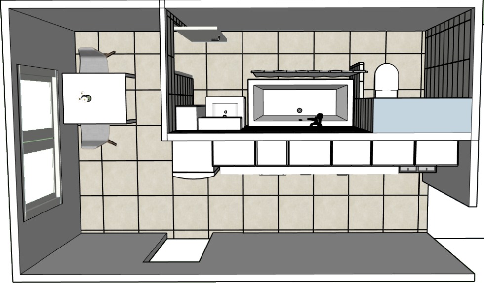 Jako designérka se snažím svým klientům ukázat i jiné možnosti využití daného prostoru. Vysvětlit jaké výhody získají a přesvědčit je o lepším využití místa. Zpracovala jsem dispozici, kterou můžete vidět na obrázku č. 2. Požadavky, klientů jako světlé obklady, velká vana, umyvadlová a vysoká skříňka jsou v návrhu zakomponované. Jediné, od čeho jsem upustila byl průchod na wc.