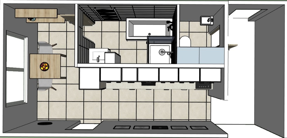 A co jsme touto úpravou získali? Z obrázku je patrné, že máme využití pro veškeré stěny, a ještě se nám vešel sprchový kout, který ovšem nebyl v původních požadavcích klientů. Místo pro pračku zde není, jelikož klienti i nadále trvali na jejím umístění do kuchyňské linky.